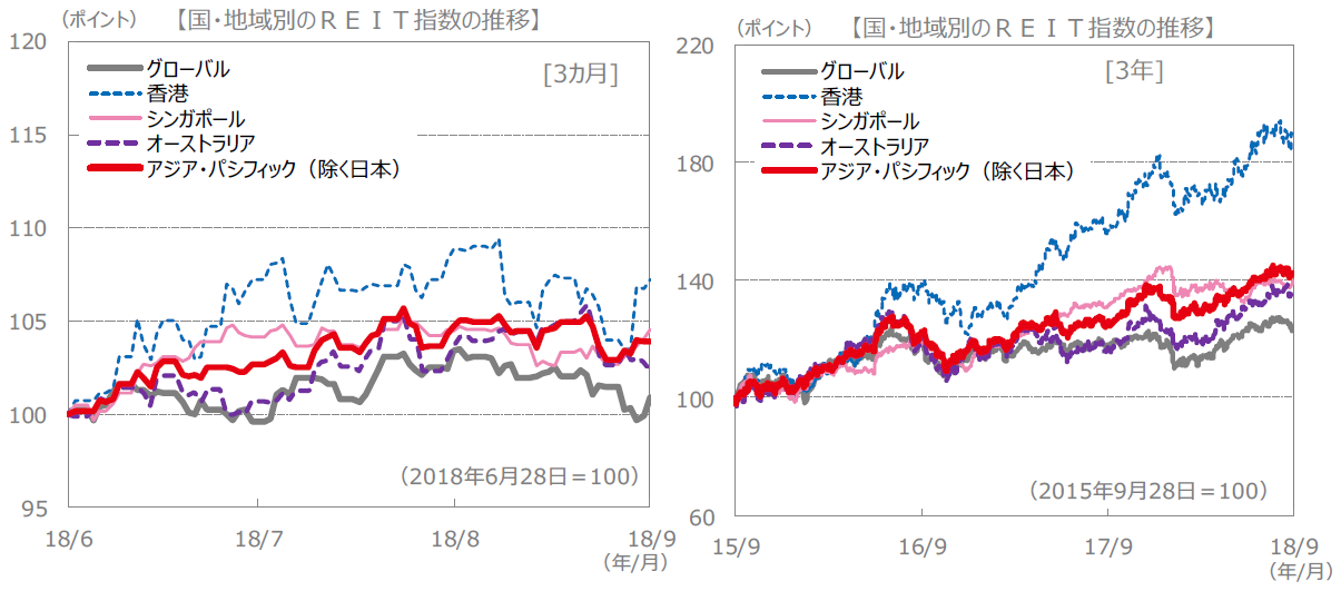 先週のアジアリート市場は、香港、シンガポール市場が上昇しました。米連邦準備制度理事会(FRB)が政策金利を引上げたものの、示唆された先行きの利上げペースが緩やかだったため、米長期金利が低下しました。これが好感されて、相対的に利回りの高いリート市場へ資金が流入しました。また、通貨は、前述の米利上げを受けて円安・ドル高が進行したことから、香港ドル、シンガポールドルが対円で上昇しました。