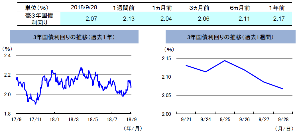先週の豪州の3年国債利回りは、低下しました。先週は、米連邦準備制度理事会(FRB)が市場予想通り利上げを実施した一方、今後の利上げ見通しが緩やかなものだったことから米国債利回りが低下し、連れて豪ドルの3年国債利回りは低下(債券価格は上昇)しました。