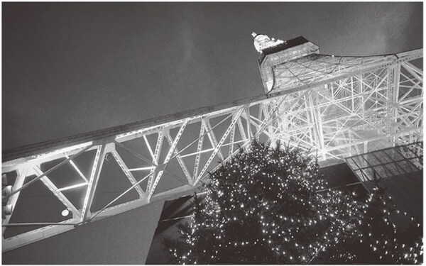 メートルの、当時としては世界一高い自立式鉄塔が建設された。写真5のように、「三角形の鉄」を組み合わせたトラス構造で造られている。トラス構造は、タワー・鉄橋・建築物等に活用されている。これは、なるべく少ない鉄の量で地震・風・雪等の外力に対して強くなるからである。もちろん、見た目も美しい。鉄骨の合間から見える青い空・日没直後の群青色の空の色(夜景学という学問では、「ブルーモーメント」という)が絶景である。鉄骨の形成については、トラス以外にラーメン構造(柱とはりを組み合わせた直方体)・アーチ構造(曲線上のもの)の形式がある。