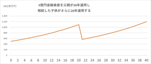 次に、父親が5億円で金融商品(利回り4%)を購入し、利子・配当の再投資を続けて20年間運用を行い、相続を迎えるシナリオを検討します。相続人である子供が運用を継続し、さらに20年間運用を行いますと(トータル40年間の運用です)、次の図表5のように12億円まで増えます。
