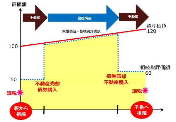資産価値1億円の債券の相続税評価額は1億円であり、これらは同額です。税率50%とすれば、相続税負担は5千万円となります。これに対して、資産価値1億円のタワーマンションの相続税評価額は約2千万円であり、資産価値と相続税評価額には80%を超える乖離があります。その相続税は約1千万円となり、資産価値に対する負担率は10%まで下がります。つまり、金融商品は相続税負担が重い資産であるのに対して、不動産は相続税負担が軽い資産なのです。