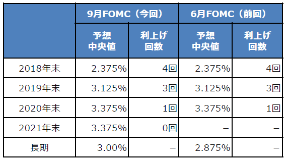 9月25日、26日に開催された米連邦公開市場委員会(FOMC)では、予想通り0.25%の利上げが決定されました。なお、FOMCメンバーが適切と考える政策金利水準の分布図、「ドットチャート」が示唆する0.25%の年間利上げ回数は、2018年が4回、2019年が3回、2020年が1回となり、前回6月時点でドットチャートが示唆した回数から変化はありませんでした。なお、今回から新たに2021年末の見通しがドットチャートに加わりました。ドットの中央値は2020年と同じ3.375%となり、その結果、2020年での利上げ打ち止めが示された格好になりました。一方、長期(Longer run)のドット中央値は2.875%から3.00%に上昇しましたが、これは9月17日に米連邦準備制度理事会(FRB)副議長に就任したリチャード・クラリダ氏が3.00%予想を提示した可能性が高く、それが影響したものと推測されます。