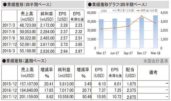 部門別の売上高は、主力の医療保険が13.21%増の440億8400万ドル、製品が9.34%増の67億200万ドル、サービスが19.51%増の41億400万ドルに伸びた。事業別の増収率は、「ユナイテッド・ヘルスケア」と「オプトゥム」がそれぞれ13.26%、11.13%。全体の営業利益は18.75%増の40億5300万ドルに伸び、営業利益率が7.0→7.3%(↑0.3ポイント)に改善した。
