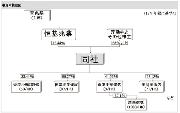 投資会社の恒基兆業発展(97/HK)、都市ガスの香港中華煤気(3/HK)、ホテル運営の美麗華酒店企業(71/HK)、不動産投資・フェリー運営の香港小輪(50/HK)などの上場子会社を擁する。香港で保有する主なビル・商業施設は「国際金融中心」「宏利金融中心」「屯門時代広場」など。17年末の香港土地ストックは建築面積ベースで2470万平方フィート。ほかに新界で4490万平方フィートを保有する。