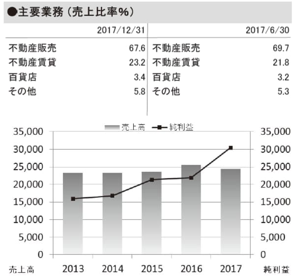 17年12月期(本決算)は4%減収、39%増益。投資用不動産の再評価益など、一時要因を除いたコア利益ベースでも38%増益を達成した。関連会社や合弁会社の貢献により、不動産販売部門の利益が大幅に膨らんでいる。米国で利上げサイクルが始まったものの、香港では域内への資金流入を背景に低金利環境が持続。住宅需要が堅調に推移し、地価・住宅価格ともに過去最高水準に達した。こうした経営環境の中、同社グループの不動産販売部門は売上高こそ0.8%減の203億7200万香港ドルとほぼ横ばいだったものの、利益は41.4%増の60億5500万香港ドルに拡大。