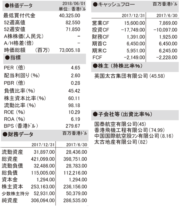 不動産、航空、飲料、海洋サービス、各種商工業の5分野に多角化した多国籍コングロマリット。全従業員は8万2000人以上に上る。不動産のコアは12年に上場した太古地産(1972/HK)で、香港、中国、米国、英国で事業展開。航空のコアは国泰航空(キャセイ航空:293/HK)と香港飛機工程(HAECO:44/HK)、飲料ではコカ・コーラのボトリングパートナーである太古飲料が香港、台湾、中国12省市、米国西部を独占する。