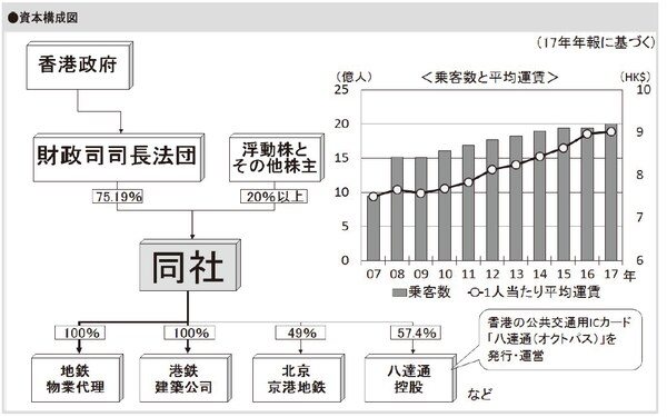 地下鉄(観塘線、セン湾線、港島線、東湧線、将軍澳線、ディズニーランド線、九鉄線)のほか、機場快線(空港特急)やバスを運営。沿線で不動産事業も手がける。中国本土や海外でも事業展開。北京、深セン、杭州などで地下鉄の建設・運営を行うほか、07年にロンドン地下鉄5路線、09年にストックホルム地下鉄、14年にシドニー地下鉄北西線などの運営権を相次いで取得した。