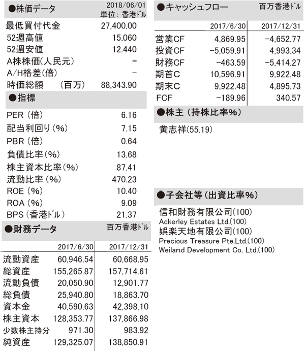17年12月中間期は64%減収、201%増益。成都市(四川省)の複合物件「信和・御龍山」の権益80%を売却したことで、56億5300万香港ドルの譲渡益を計上した。残る権益20%について、評価益7億6190万香港ドルを計上したことも利益積み上げにつながっている。
