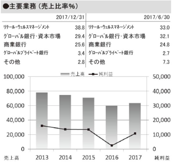 17年12月期(本決算)の税引き前利益は、報告ベースで前年比141.4%増の171億6700万米ドルに達した。為替レートなどの影響を織り込んだ調整後ベースでは、前年を10.9%上回る209億9000万米ドル。一般企業の売上高に相当する経常収益は、前年比6.6%増の637億7600万米ドルに伸びた。リテール、商業銀行など各業務が安定成長する中、収益の増加を確保した格好。15年に着手した各種リストラの効果も発揮され、営業費用は前年から12.4%減少した。ただ、利ざやの縮小や減損コストの計上を受け、調整後ベースの税引き前利益は市場予想を下回った。
