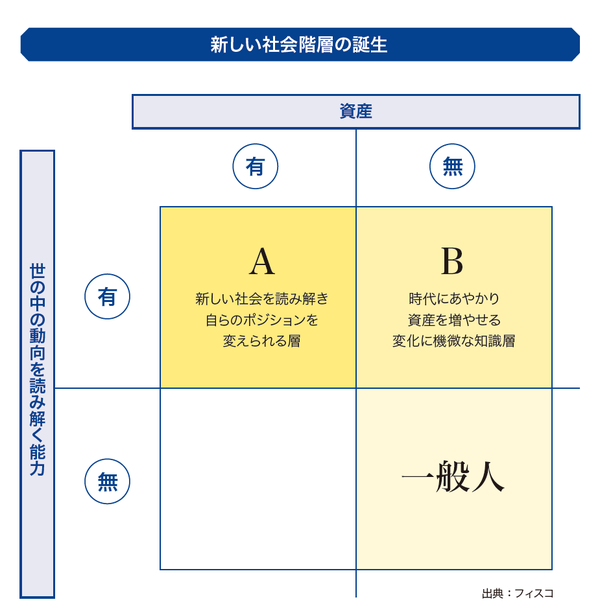 図のカテゴリーAは、現在および将来の経済・マーケット動向を読み解くことができ、成長分野への投資をともなって、自らのポジションを変えられる人たちだ。一方、図のカテゴリーBは、ITバブル時のように、世の中の動きを読んで成長資金の集中にあやかり、資産を増やす、築くことができる時代の変化に機微な知識層だ。