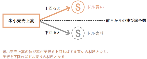 前月からの伸び率が予想を上回れば、景気好調との見方につながり、ドルが買われます。