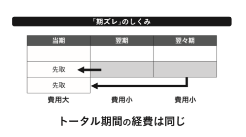次に考えられるのは、「翌期以降の費用を先取りして当期の費用に入れる」というものです。これを「期ズレ」といいます。