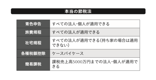 消費税については、そもそも免税の期間を長くすることが一番の節税ですが、法人設立初期にしか使えないので、該当する会社は少ないでしょう。簡易課税も、課税売上高が5000万円までという縛りがあるので、業種によってはまったく該当しない場合もあります。該当するならどちらが有利かを判定する程度の認識でよいでしょう。