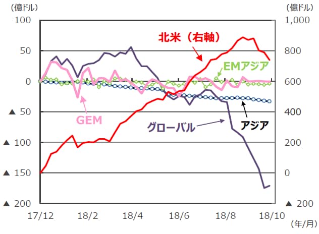 ■先進国は▲101億ドルですが、「アジア(注3)」は113億ドルの大幅な流入超となりました。中心は「日本」(118億ドル)です。10月第3週(58億ドル)、第4週(53億ドル)と大幅な流入超となりました。また、「北米」は▲128億ドルの大幅な流出超となりましたが、10月第4週には22億ドルの流入超に転じました。