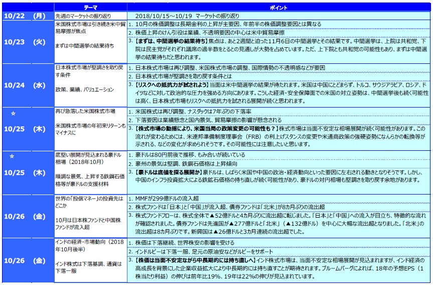 三井住友アセットマネジメント株式会社が、2018年10月22日~10月26日のマーケットについて振り返り、「1. 先週の市場動向、2. 先週のマーケット・デイリー/ウィークリー、3. 今週の主な注目材料」のそれぞれについて解説します。今回は、「2. 先週のマーケット・デイリー/ウィークリー」を見ていきましょう。※本連載は、三井住友アセットマネジメント株式会社が提供するマーケットレポートを転載したものです。
