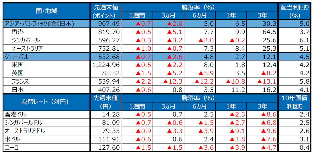 先週のアジアREIT市場は、香港、シンガポール、オーストラリアの3市場とも下落しました。米中貿易摩擦の影響で世界景気が減速するとの懸念が強まる中、一部米国企業の失望的な決算を受けて日米欧やアジアの株式市場が下落するなど、リスク回避の流れが高まったことが下落の要因です。また、通貨は前述のリスク回避の流れから、安全資産とされる円が買われたため、対円で下落しました。