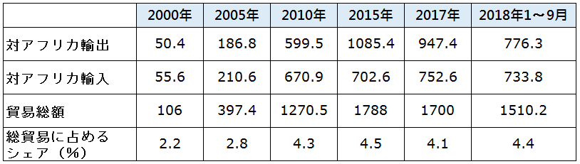 (注)現在進行している米中貿易戦争が経済面でアフリカに対しいかなる影響を及ぼすか、プラス、マイナス様々な見方が交錯している(Girard、10月25日付 The Diplomat)。アフリカにとってプラスと見る見方は、①米国に輸出される中国製品に追加関税が課せられることにより、中国以外の対米輸出製品の競争力が高まる。特にナイジェリア等多くのサブサハラ諸国が協定に基づき、多くの製品が関税ゼロで米国市場に輸出できるようになっており、この機会を利用できる、②中国企業が米国の追加関税を逃れようとして、米国以外の投資先を開拓しようとし、アフリカはその選択肢の1つになる、③中国が米国からの輸入の代替として、アフリカからの輸入を拡大する(例えば、ケニアから農産物、ナイジェリアから石油など)といった点に着目している。他方、マイナス要因としては、①中国が輸出市場としての米国を失い、アフリカ市場にダンピング等の輸出攻勢を強める結果、アフリカ諸国の国内産業が打撃を受ける(例えばウガンダ)、②中国の対米輸出鈍化で中国国内経済が減速、アフリカ製品に対する需要が減少する(例えばエチオピア)といった点が指摘されている。