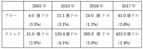 (注)フロー計数は香港経由投資を含んでいないと思われる。( )は総投資シェア。