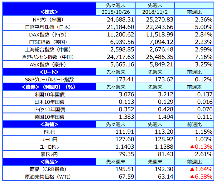 主要国の株式市場は大幅に上昇しました。米国株式市場は、トランプ米大統領が通商問題で中国と合意に達する可能性を示唆したことなどから、大幅に上昇しました。NYダウは週間では2.36%上昇しました。日本株式市場は、先週までの大幅下落の反動や円安、米国株高を受けて上昇しました。週末にトランプ大統領が中国との貿易合意の草案作成を指示したとの報道が流れると、日経平均株価は500円を超える上昇となり、週間では5.00%上昇しました。欧州株式市場では、米中通商交渉進展への期待などからドイツDAX指数は2.84%、FTSE指数は2.23%上昇しました。中国本土株市場は、米中貿易摩擦解消に向けた協議の進展への期待などから、上海総合指数は2.99%、香港ハンセン指数は7.16%上昇しました。