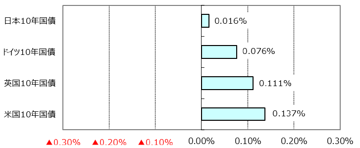 米国の10年国債利回りは、10月雇用統計で非農業部門雇用者数が大きく上振れたことや株高などを受けて、利回りが0.137%上昇しました。ドイツ、英国、日本の10年国債利回りは、世界的な株高や米国長期金利の上昇などを背景に、いずれも上昇しました。日銀の金融政策決定会合は現状維持となり、影響は限定的でした。