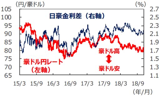 (注2)金利差は豪州-日本。金利はともに3年国債利回り。