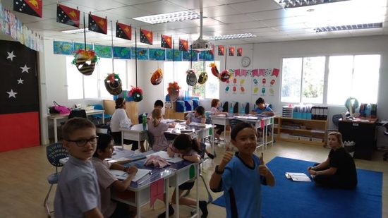 AISB:はい。いまはクラスごとに特定の国を決め、その国について皆で調べるといった形で勉強しています。このクラスでは、パプアニューギニアの言語、通貨、国旗、旅行、音楽、スポーツ、衣類、食べ物などについて調べています。