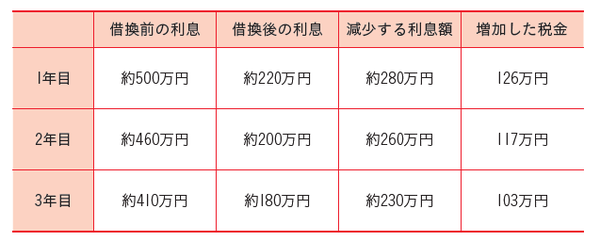「借り換えた後は、返済額が月約140万円程度になり、完済までの利息合計が約1,200万円。