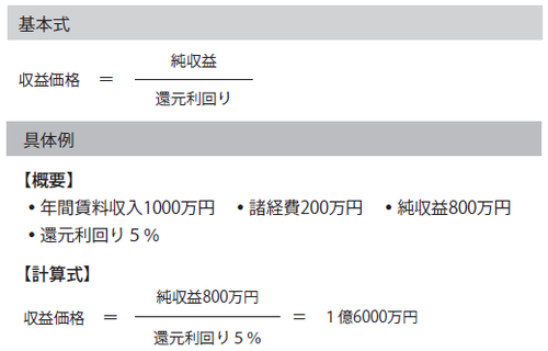 建物がアパートやマンションなどの収益物件の場合は、収益還元法という方法によって収益価格を求めます。賃料等から修繕費、固定資産税、損害保険料等の必要な諸経費を控除して求めた純収益を還元利回りで資本還元して、収益価格を算出します。