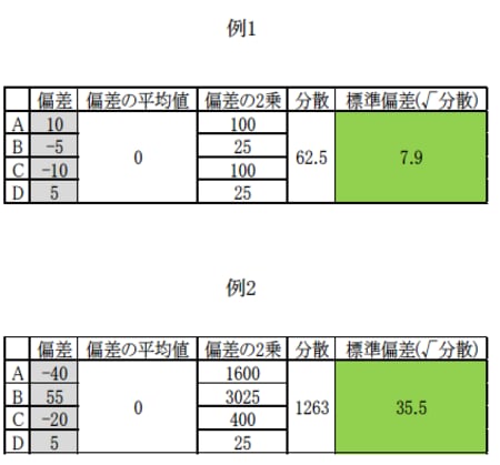 「偏差」とは、それぞれのデータが平均値に対してどれだけ離れているかを数値で表したものです。こう言うと難しく感じるのですが、各データの値から平均値を引くだけの簡単な計算で求められます。偏差を計算してみると、例1よりも例2の方が偏差の数字が大きい事がわかります(図表4)。これは、例2の方がデータのバラつきが大きい事を意味しています。