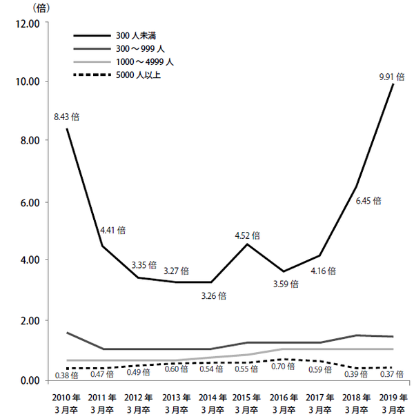 そのため、第二新卒などで転職が自由になったのは、あくまでも中小企業の話です。しかし、日本の企業の99.7%は中小企業ですから、その意味では売り手市場というのも、それほど間違った話ではありません。従業員数300人未満の中小企業では、求人倍率は9.91倍。10人の採用を打ち出しても、就職を希望する新卒が1人しか説明会に来てくれない状況です。