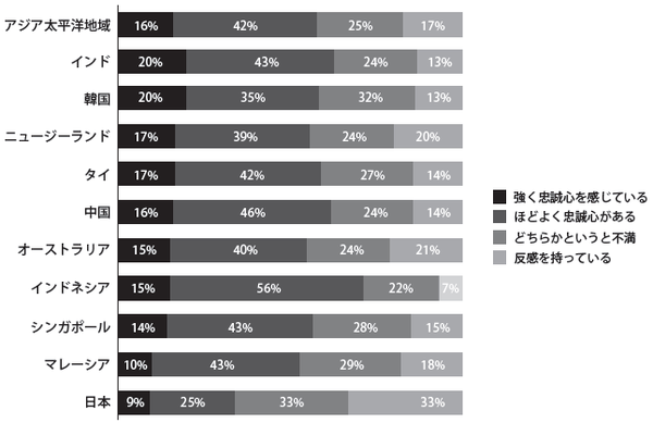 アメリカの人材コンサルティング会社が2013年に行った「従業員忠誠度(employee engagement)の各国比較」によれば、日本の社員で「会社に強く忠誠心を感じている(highly engaged)」と回答した人の割合は、調査対象国中で最低の9%でした。
