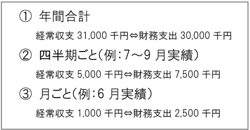 次の視点としては、借入金の返済等の財務支出を本業の「経常収支」と比較することだ。これにより上期は経常収支が赤字で預金を取り崩して返済している、下期の回収増で何とか経常収支が黒字になり、ようやく返済原資が確保できた――といったことが見えてくる。