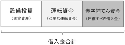 資金繰りの財務収支を考えるにあたって、B/S(貸借対照表)の借入金を色分けすることも重要になる。土地や建物等の固定資産に充てている「設備資金」と、必要な運転資金に充てている「運転資金」とに色分けするのだ。これ以外の借入金は過去からの「赤字補てん資金」と見て、早急に圧縮すべき借入金と見ていく(図表1)。