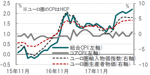 次にインフレについては総合の消費者物価指数(CPI)は前年比2%前後で推移しています(図表2参照)。コアCPIは横ばいの動きですが、生産者物価や輸入価格、さらに好調な雇用市場を反映してドイツなどの賃金が上昇している点などをドラギ総裁は指摘しています。12月に公表されるECB経済予測ではインフレ率見通しの上方修正も想定されるようなトーンで、ECBの債券購入停止の公算が高まります。
