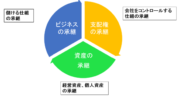 事業承継には、「ビジネスの承継」、「支配権の承継」、「資産の承継」の3つの側面があります。