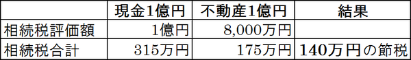 現金による相続税と不動産による相続税の比較を見てみましょう。