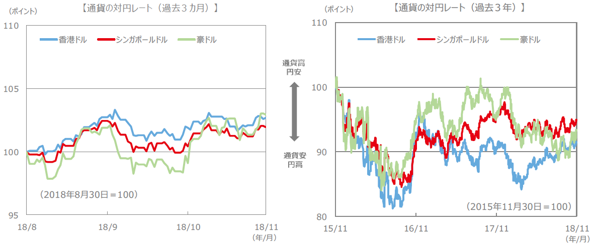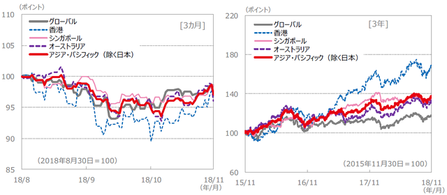 先週のアジアREIT市場は、パウエル米連邦準備制度理事会(FRB)議長のハト派発言などを受けて米利上げ早期終了観測が強まり、米国や自国・地域の長期金利が低下したことから香港、シンガポール市場が上昇しました。オーストラリア市場は自国の株式市場が下落したことから、反落しました。また、通貨は対円で上昇しました。世界的な株価上昇を受けて安全資産とされる円が売られたことなどが背景です。