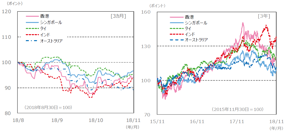 先週のアジア株式市場は、総じて上昇しました。パウエル米連邦準備制度理事会(FRB)議長のハト派発言などを受けて米利上げ早期終了観測が強まり、新興国市場からの資金流出懸念が後退しました。また、主要なアジア通貨は、世界的な株価上昇を受けて安全資産とされる円が売られたほか、対米ドルで上昇した通貨もあり、対円で軒並み上昇しました。