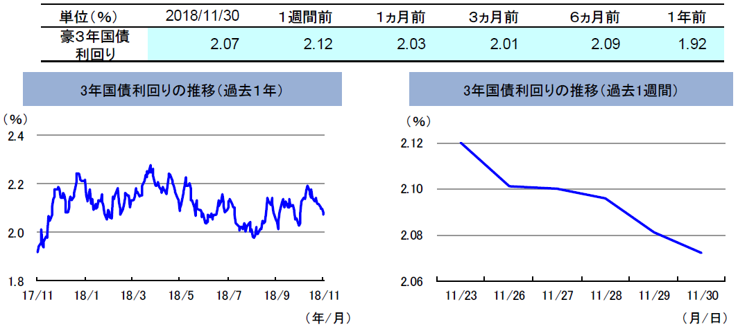 先週の豪州の3年国債利回りは、低下しました。先週は、FRBのパウエル議長の発言により、米国の利上げ見通しが緩やかなものになるとの見方が優勢となったことから、米国金利が低下したことに連れて、豪州の3年国債利回りは低下(債券価格は上昇)しました。