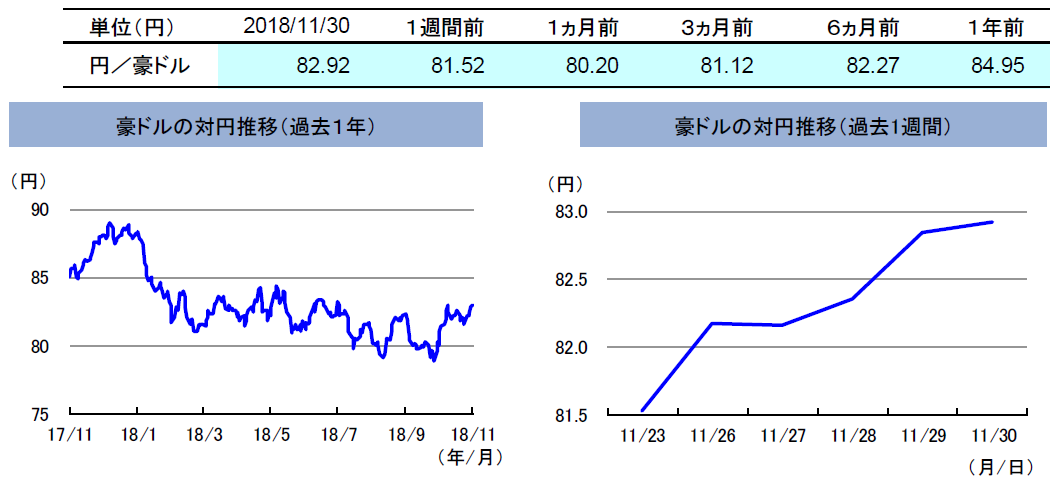 先週の豪ドルの対円レートは、上昇しました。先週は、米連邦準備制度理事会(FRB)のパウエル議長が米国の政策金利は中立水準を若干下回っていると発言したことから、米国の利上げ見通しが緩やかなものになるとの見方が優勢となり、米ドル安・豪ドル高となりました。また、週末に控えた米中首脳会談での貿易摩擦緩和への期待から、豪ドルの対円レートは上昇しました。