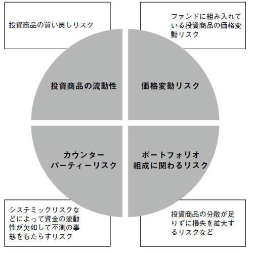 ●組み入れファンドにおける流動性リスク・・・例えばファンド・オブ・ファンズなどの場合、組み入れているファンドが前記のようなリスクを抱えているため、結果としてファンド・オブ・ファンズが流動性リスクにさらされる場合があります。