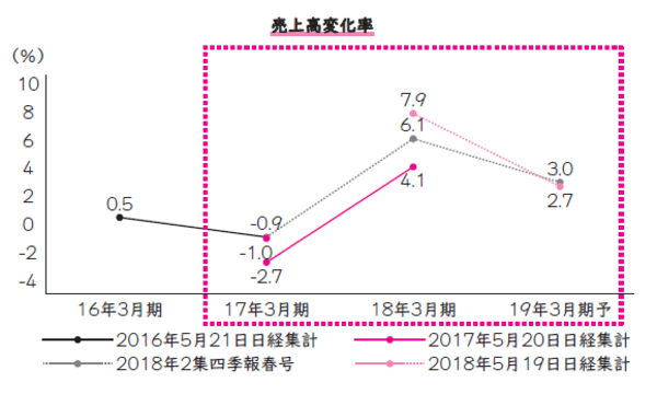 17年から18年は、マイナス2.7%(実績)から4.1%の増収予想だった。結果は、7.9%に上振れて着地している。