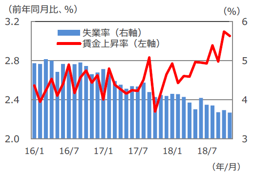 ■一方、賃金は前月比0.2%増、前年同月比で3.1%増となりました。前年比の伸び率は、前月に続き3%台を維持しました。