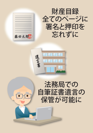 これまで自筆証書遺言は全文を手書きしなければなりませんでしたが、財産目録についてはワープロ作成が可能になりました。ただし、目録のページごとに署名押印が必要です。また、預金通帳のコピーや登記事項証明書の添付もできるようになります。