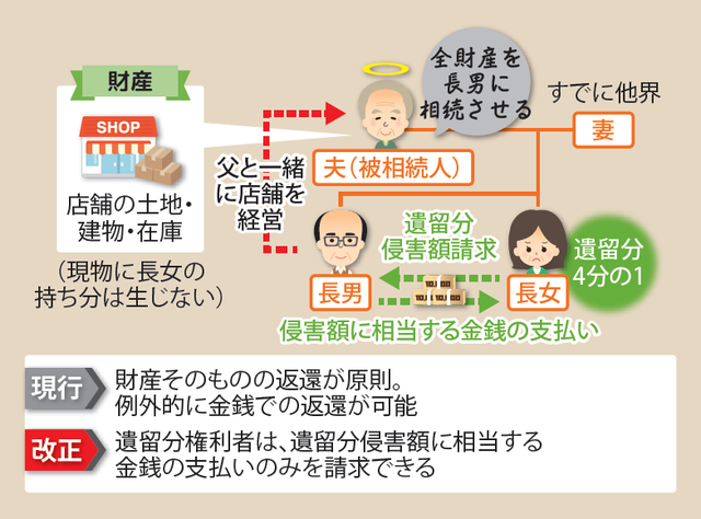 今回の改正により、最初から遺留分に相当する金銭の支払いを請求(遺留分侵害額請求)できるようになります。現物に持ち分が生じないので、特に事業承継を伴う相続などにありがたい制度です。
