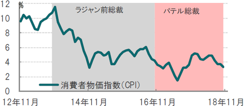 パテル総裁の前任で、元国際通貨基金(IMF)チーフエコノミストでもあったラジャン前総裁も、パテル総裁同様、モディ政権と対立して1期3年で退任し、再任はかないませんでした。パテル総裁も元IMFエコノミストで、ラジャン前総裁の改革路線の後継者と見られます。例えば、ラジャン前総裁就任以降のインドのインフレ率を見ると、インド中銀の目標である4%(±2%)を達成したと評価できる推移となっています(図表2参照)。