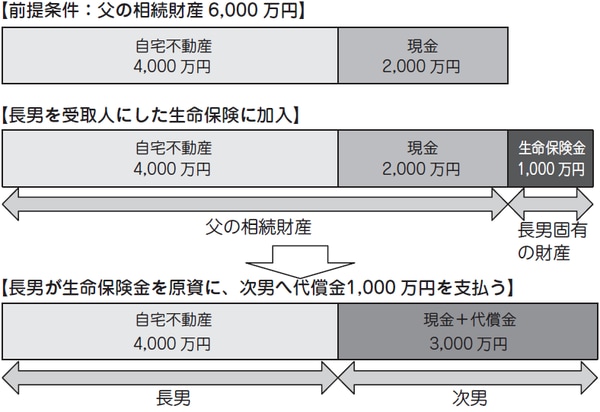 自宅不動産を相続するかわりに受け取った生命保険金を代償金として次男に渡すことにより、平等な遺産分割が可能となるのです。