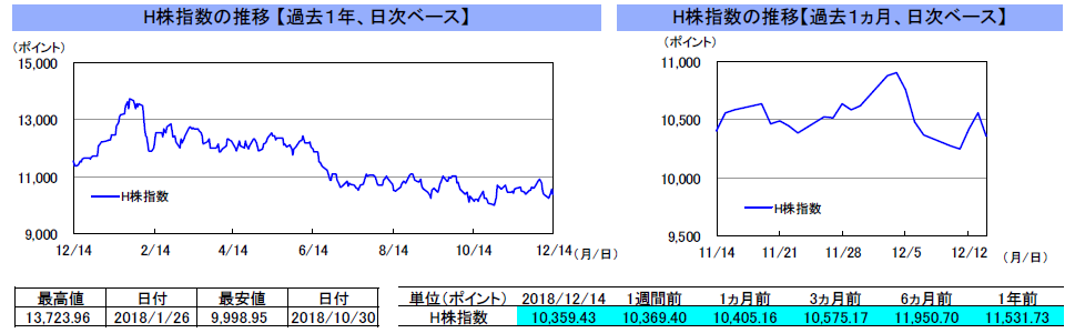 先週の中国本土市場は、上海総合指数が前週末比▲0.5%、深セン総合指数が▲1.7%と下落しました。貿易摩擦問題に関し、米中間の協議の中で中国側から前向きな検討がなされている様子が報道された他、中国通信機器最大手の副会長が保釈されたこと等を受けて、米中貿易摩擦問題が進展するとの期待が高まり、投資家センチメントが改善する局面もありました。ただし、11月の輸出入、小売売上、鉱工業生産などの経済指標が予想を下回り、これが嫌気されて、相場は下落しました。香港市場は、H株指数が前週末比▲0.1%、レッドチップ指数が+0.7%となりました。11月の中国の経済指標が予想を下回った一方、米中貿易摩擦問題が進展するとの期待が高まったこともあり、株価はまちまちな動きとなりました。