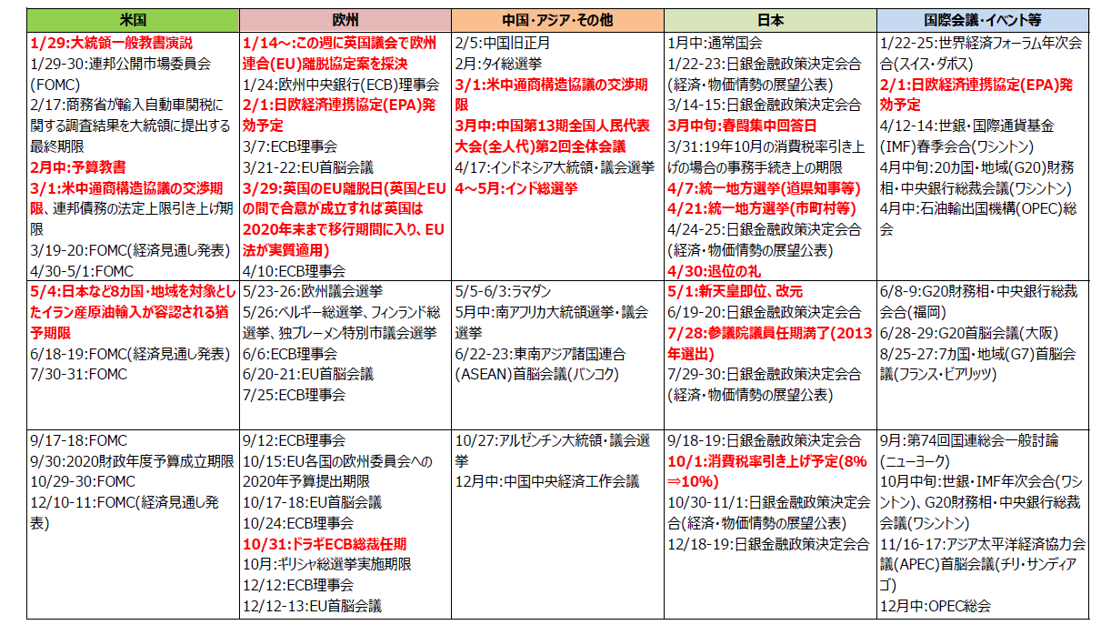 各国・地域の経済指標、金融政策決定会合等イベントの予定(2019年)