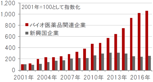 ※バイオ医薬品関連企業:ナスダック・バイオテック指数、新興国企業:MSCI新興国株価指数構成銘柄